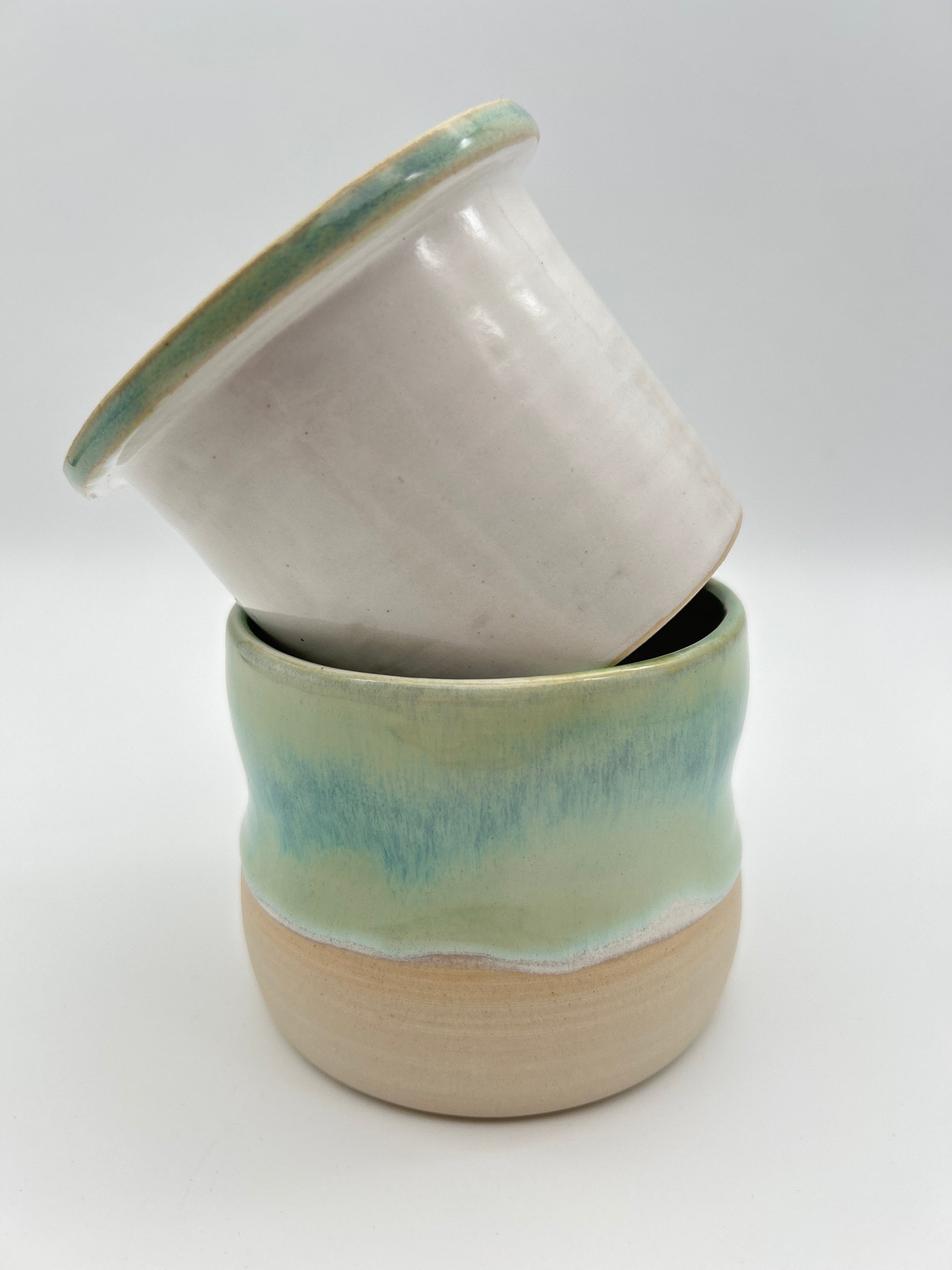 Hold meg smørklokken her en bølgete form på utsiden. Den "roper" -Hold meg! Designet gjør det enklere å løfte den opp og flytte på den når du har fylt den med smør og den veier litt mer. En smørklokke er slik at du har smør i lokket og litt rent vann i koppen under. På den måten holder meierismør seg smøremykt også på benken.